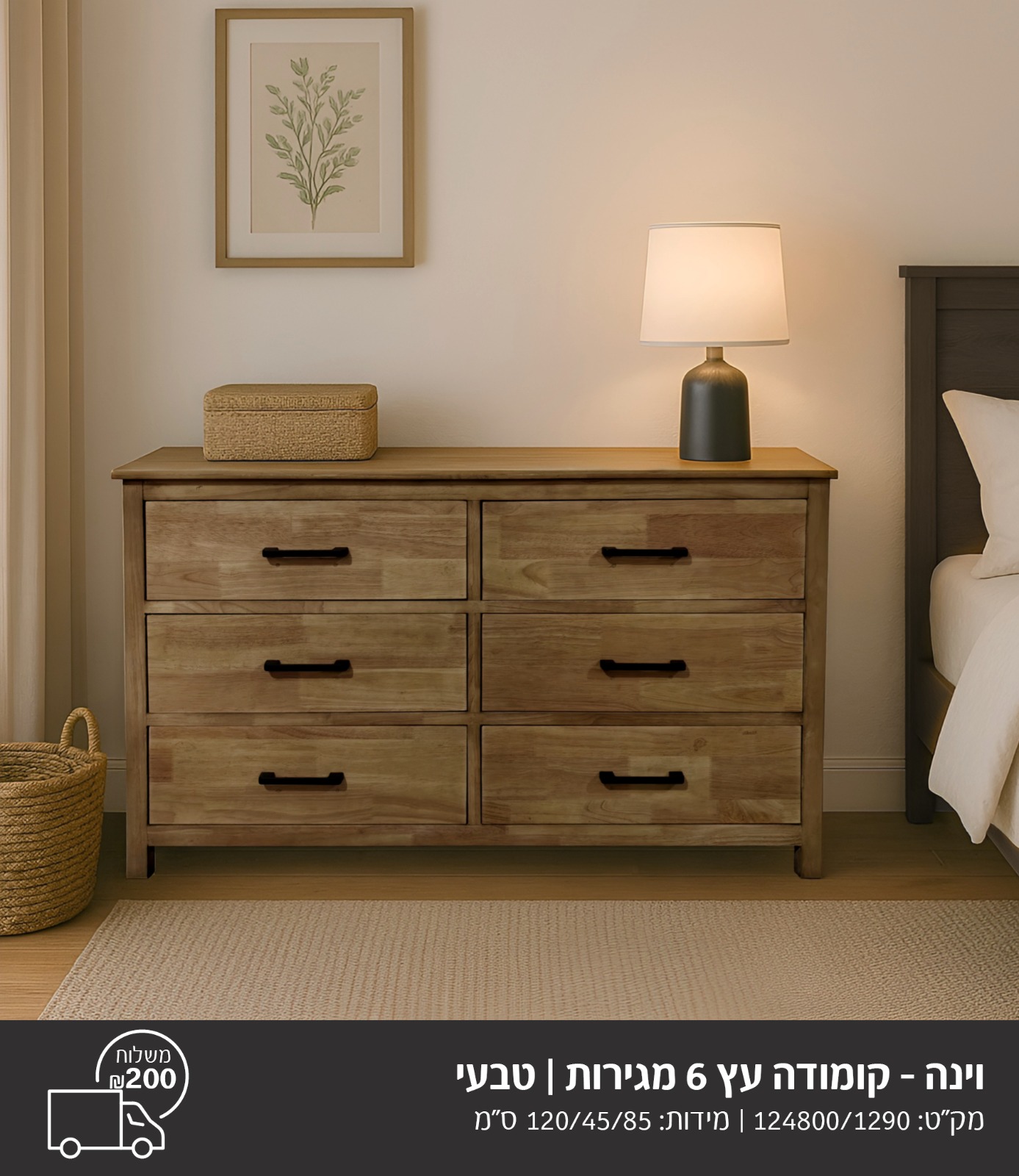 וינה | קומודת עץ 6 מגירות – טבעי