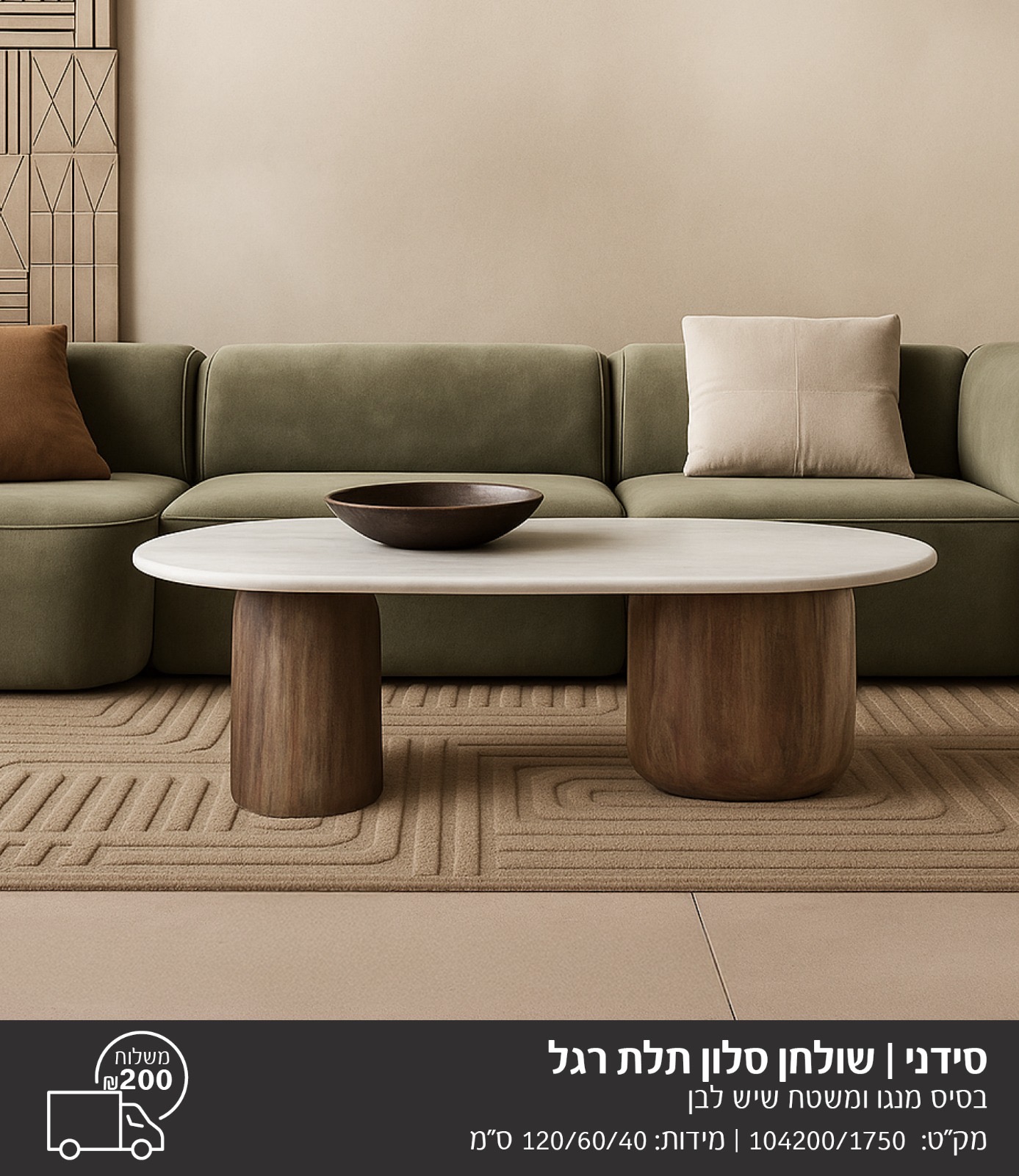 סידני | שולחן סלון תלת רגל – בסיס מנגו ומשטח שיש לבן